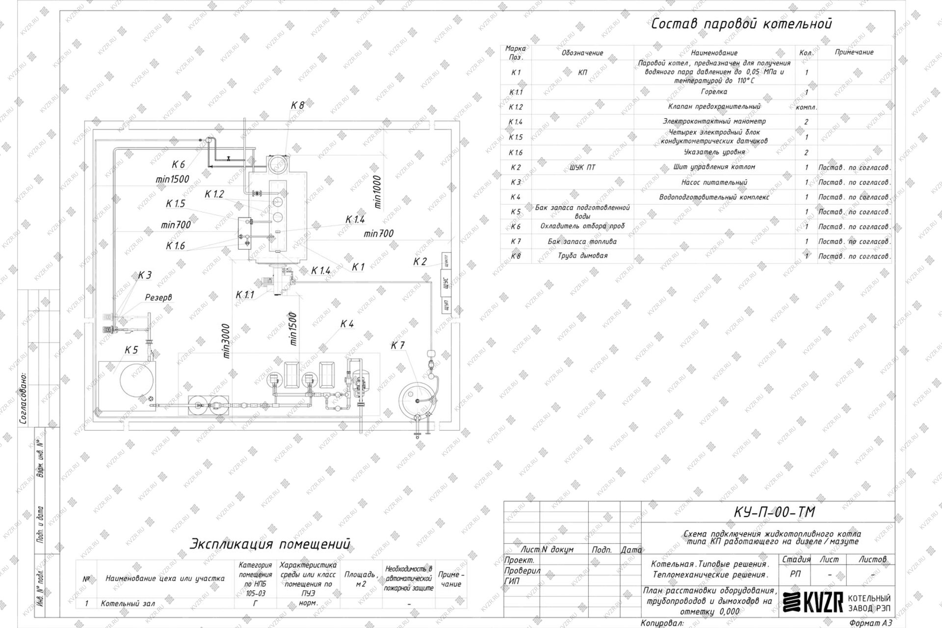 Монтаж парового котла КП 300 на мазуте в котельной должен производиться в соответствии с проектом и с учетом требований Свода правил СП 89.13330. 2016 «Котельные установки» и «Правил устройства и безопасной эксплуатации паровых котлов с давлением пара не более 0,07 МПа (0,7 кгс/см2), водогрейных котлов и водоподогревателей с температурой нагрева воды не выше 388 К (115 С)». Правильный монтаж котла – залог его надежной и долгой работы.
