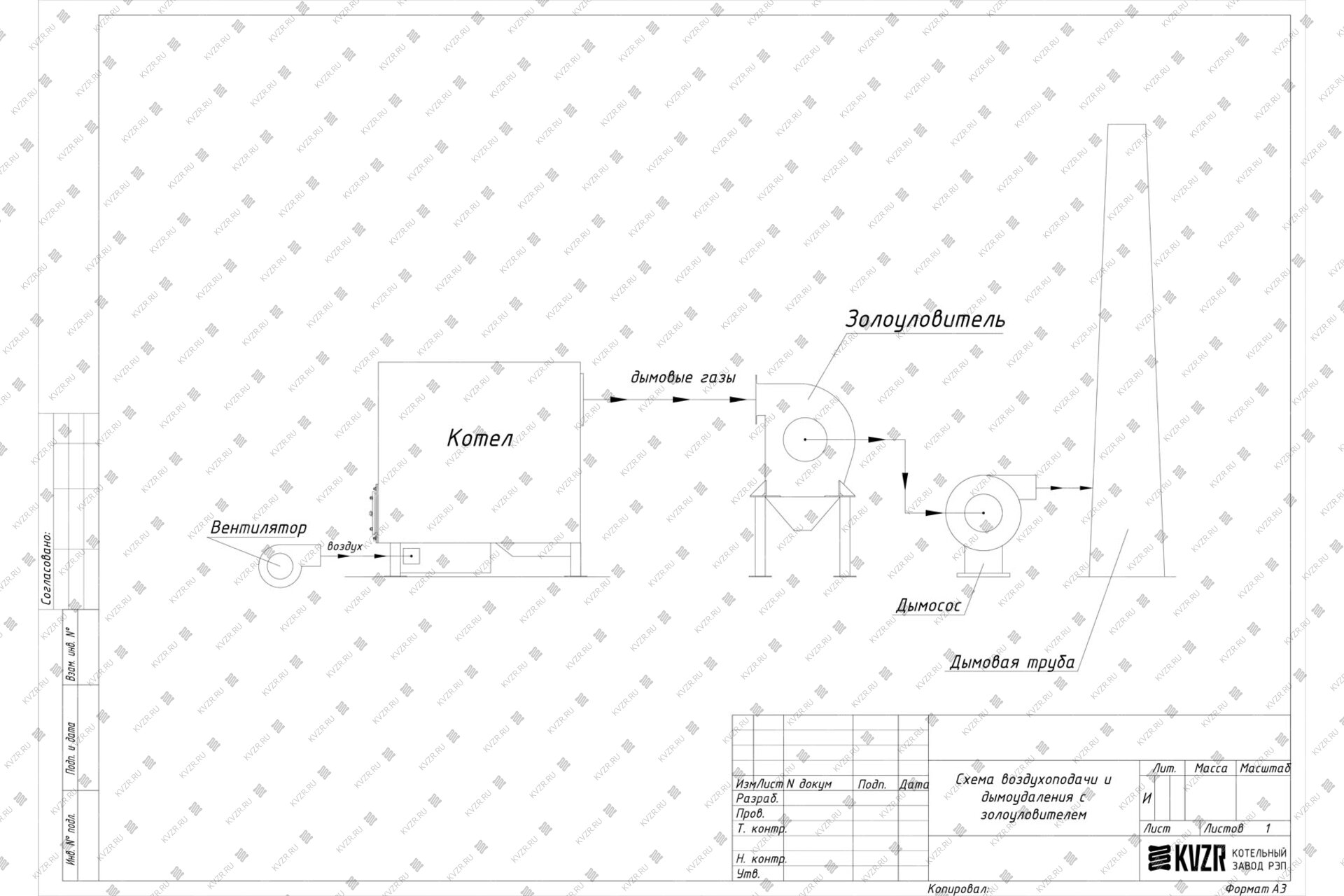 2. Горение: Воздух на горение твердого топлива подается принудительно дутьевым вентилятором. Интенсивность горения регулируется шибером на воздуховоде.