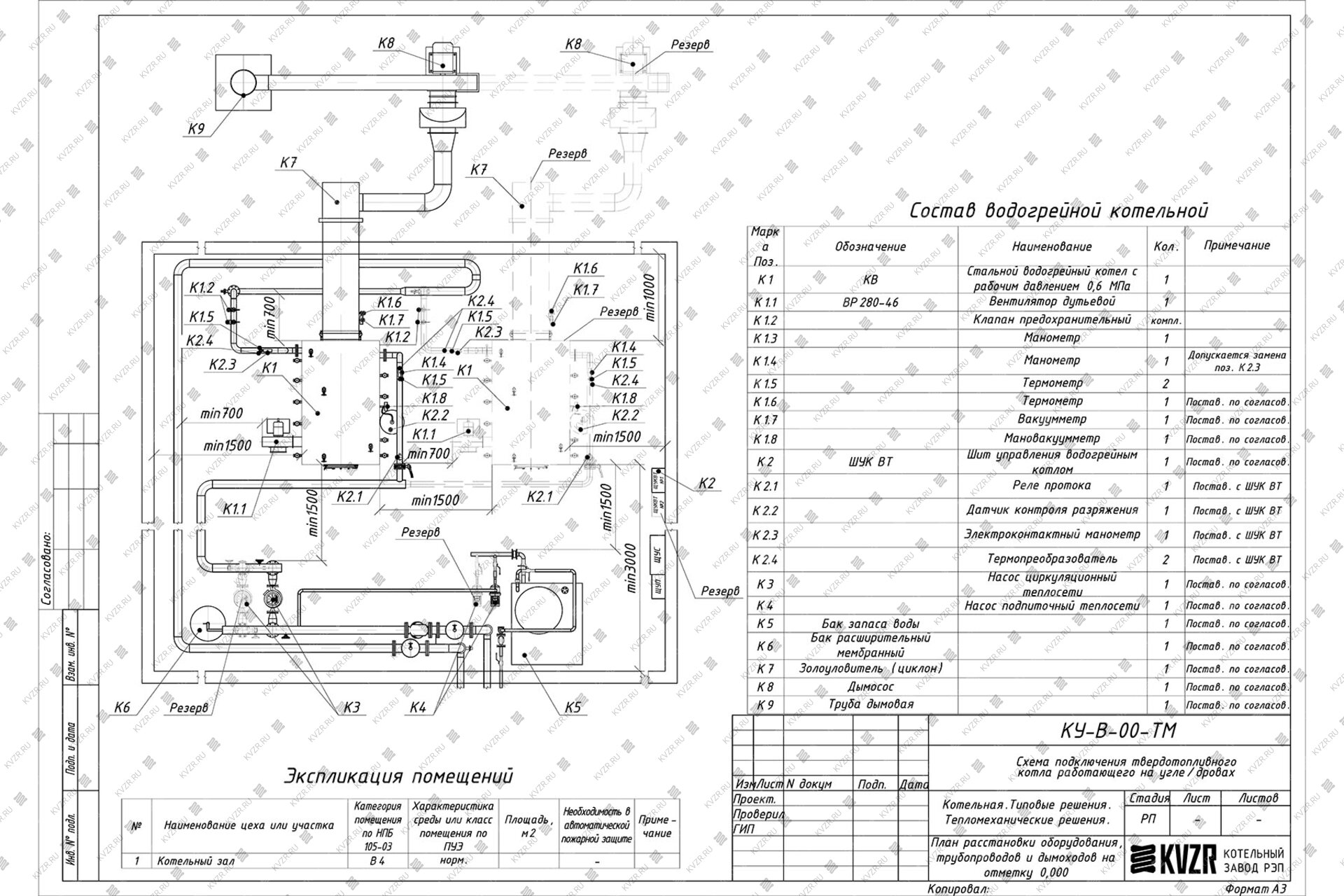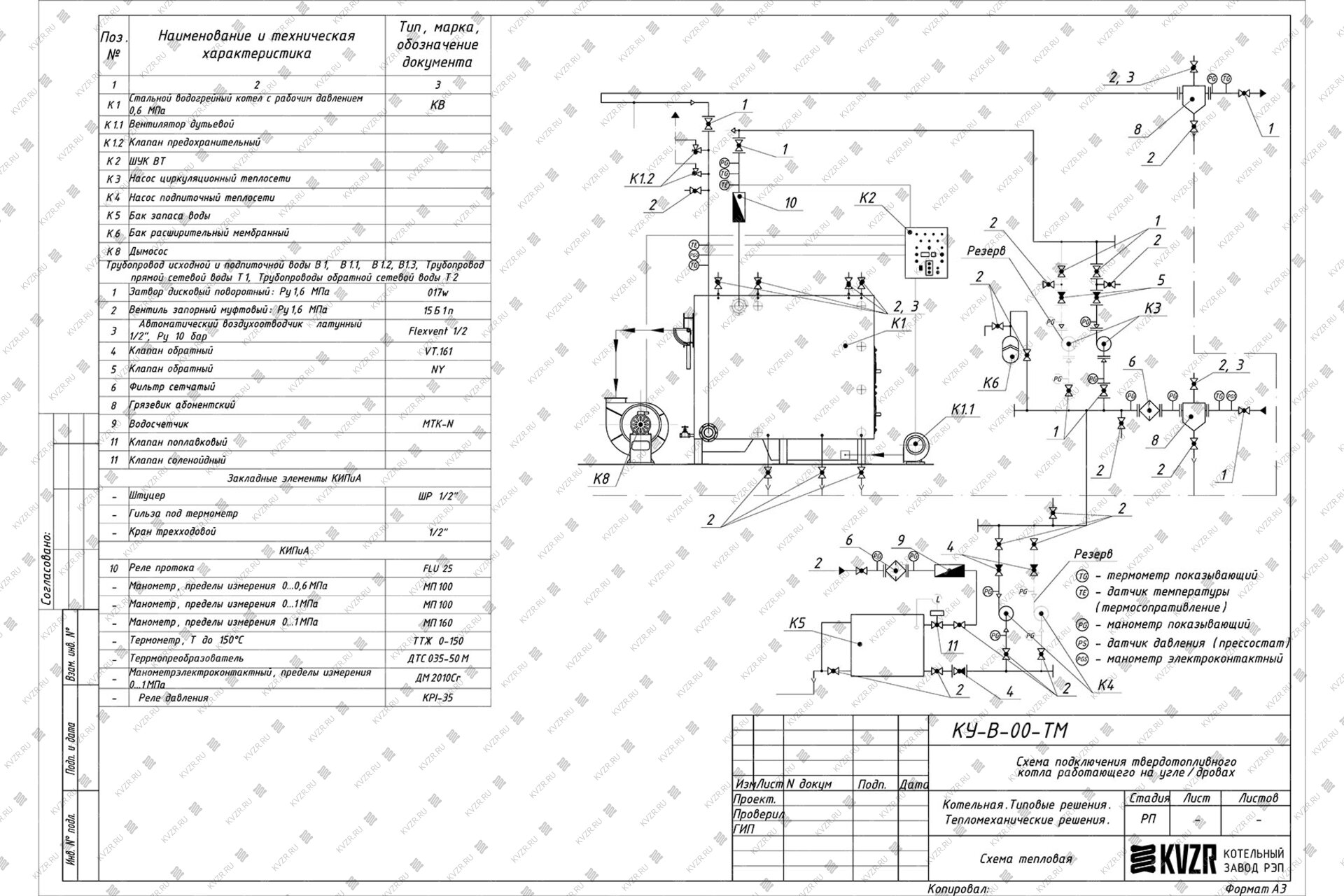 Образец тепловой схемы подключения котла 0.8 МВт уголь дрова и вспомогательного оборудования в котельной приведен на данной схеме. При эксплуатации очень важно грамотно осуществить подключение оборудования, установить все контрольно измерительные приборы, для контроля параметров работы котельной и запорную арматуру для оперативного переключения потока теплоносителя при плановой или аварийной остановке оборудования. Данную схему можно использовать как пример для разработки под свой объект или заказать у нас разработку индивидуальной схемы для вашей котельной.