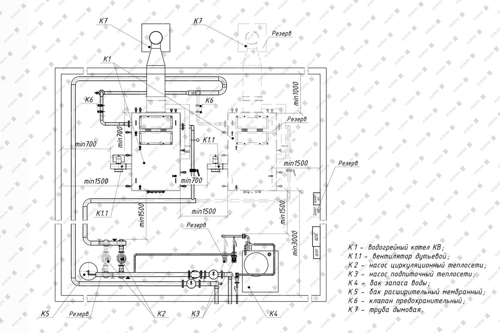 Чтобы правильно подключить котел 800 кВт на естественной тяге в котельной необходимо оставить проемы для обслуживания оборудования во время эксплуатации. На представленной здесь схеме указаны их минимальные размеры. Кроме того, в данной примерной схеме монтажа водогрейных котлов и оборудования указан перечень минимально необходимого вспомогательного оборудования для правильной работы котла.