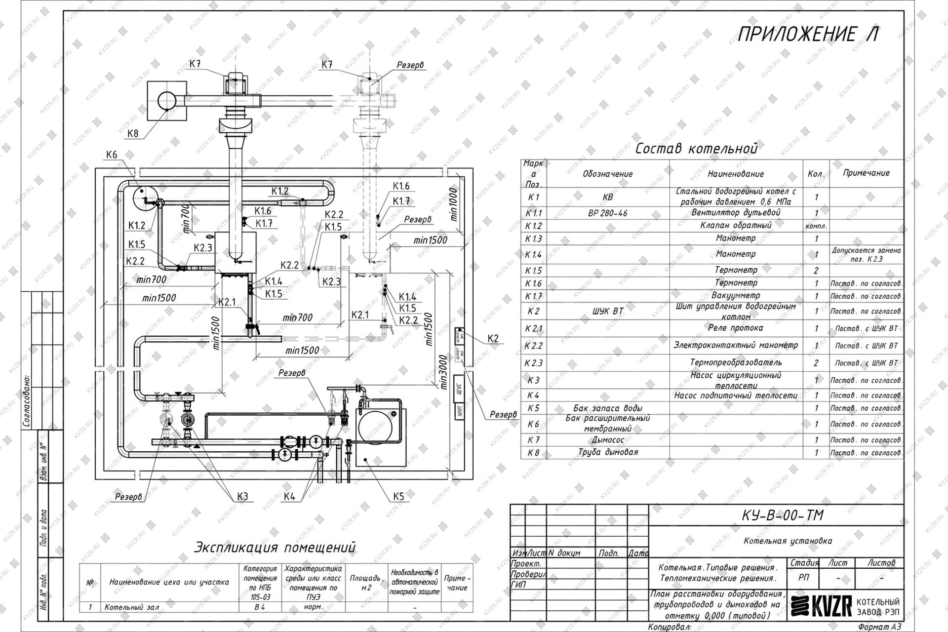 Чтобы правильно подключить котел КВр-0.25 в котельной необходимо оставить проемы для обслуживания оборудования во время эксплуатации. На представленной здесь схеме указаны их минимальные размеры. Кроме того, в данной примерной схеме монтажа водогрейных котлов и оборудования указан перечень минимально необходимого вспомогательного оборудования для правильной работы котла.