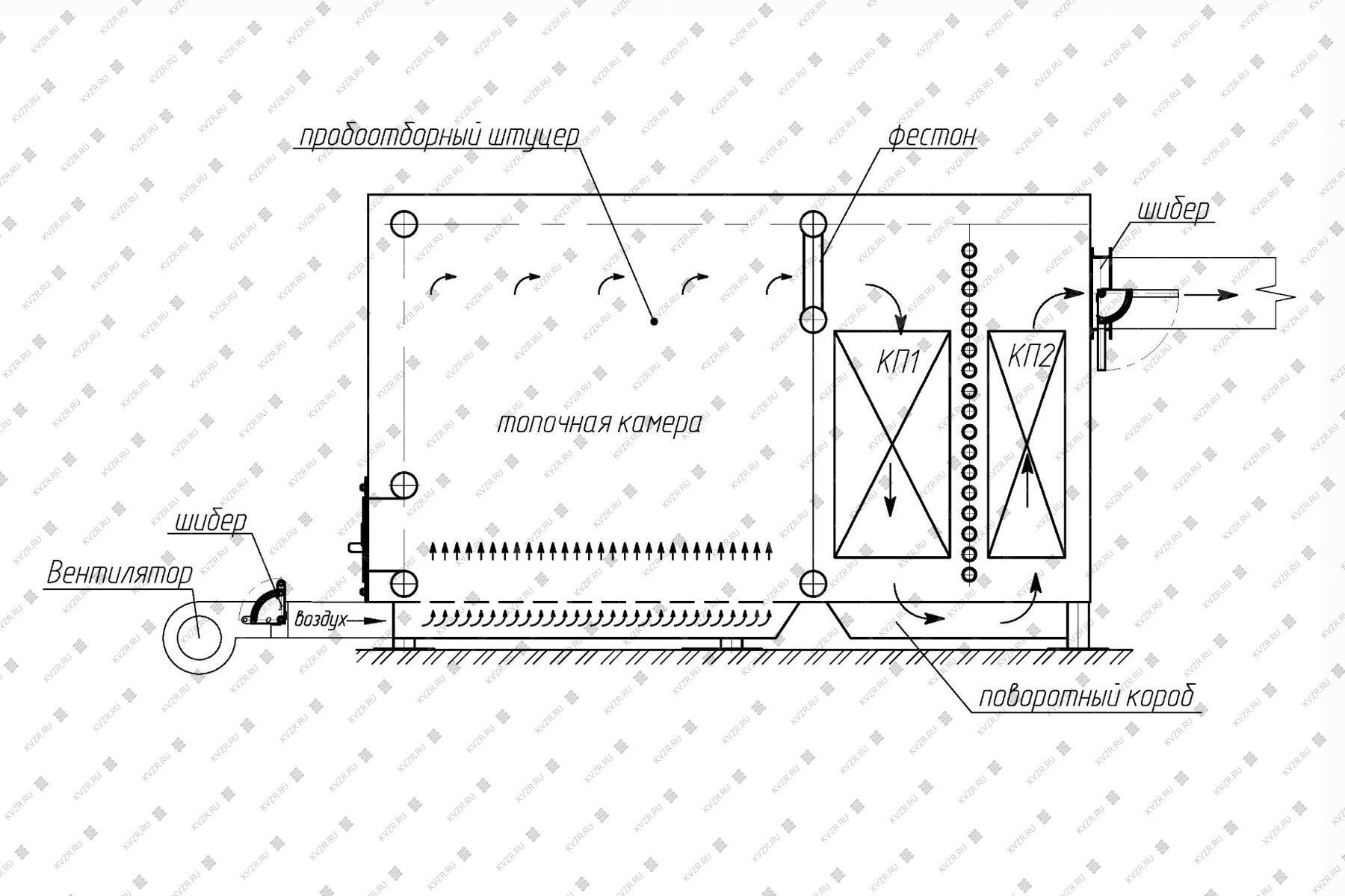 2. Горение: Воздух на горение твердого топлива подается принудительно дутьевым вентилятором. Интенсивность горения регулируется шибером на воздуховоде.