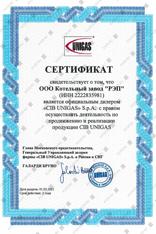 Сертификат свидетельствует о том, что ООО Котельный завод "РЭП" является официальным дилером "CIB UNIGAS" S.p.A. с правом осуществлять деятельность по продвижению и реализации продукции CIB UNIGAS