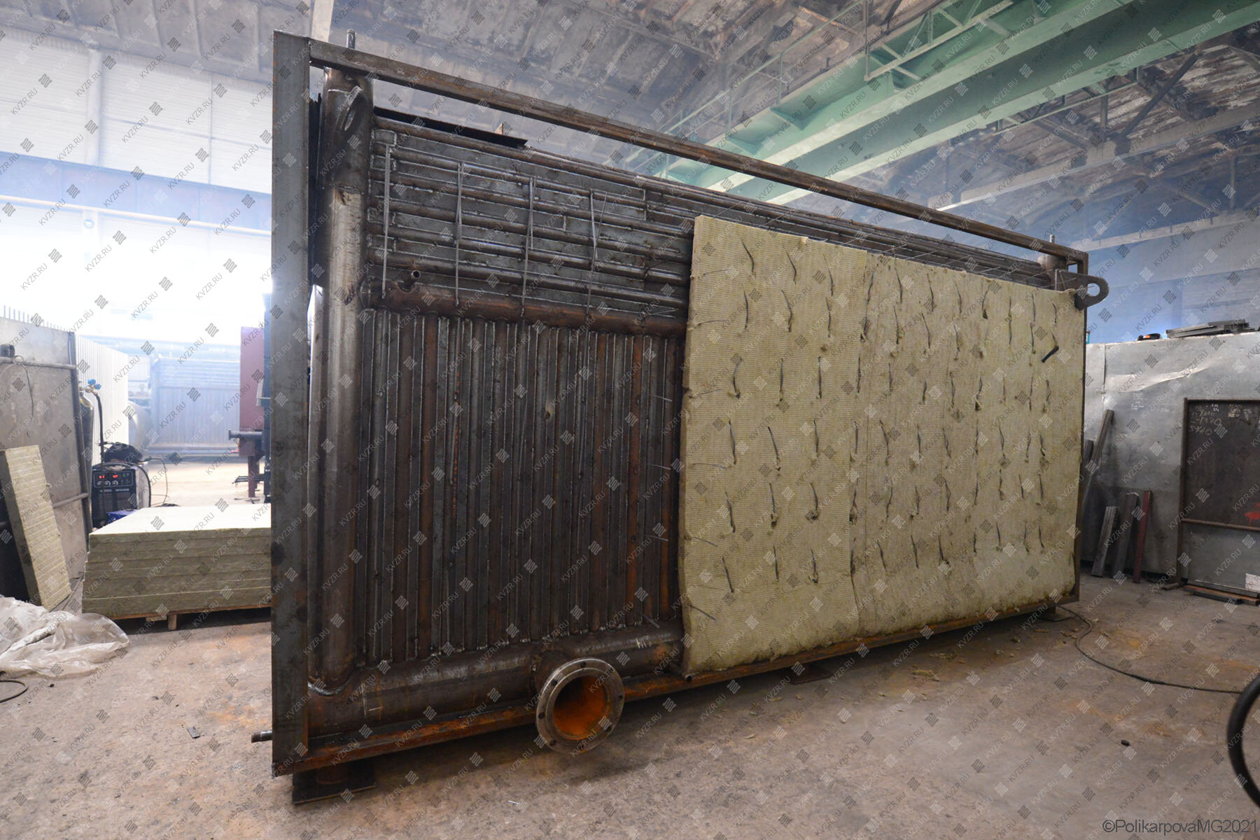 Топка котла состоит из собирающих и раздающих коллекторов, соединенных стальными трубами, марки сталь 10 и 20. Расстояние между трубами топочного блока заваривается стальной металлической полосой обеспечивая полную герметичность котла и исключая проникновение продуктов сгорание в котельный зал при работе с надувными импортными горелками. На фронте топки изготавливается дверка для обслуживания топочной камеры. В дверке изготавливается отверстие с креплением под горелку. Для наблюдения за топочным процессом на фронте котлоагрегата, имеется гляделка со смотровым стеклом.