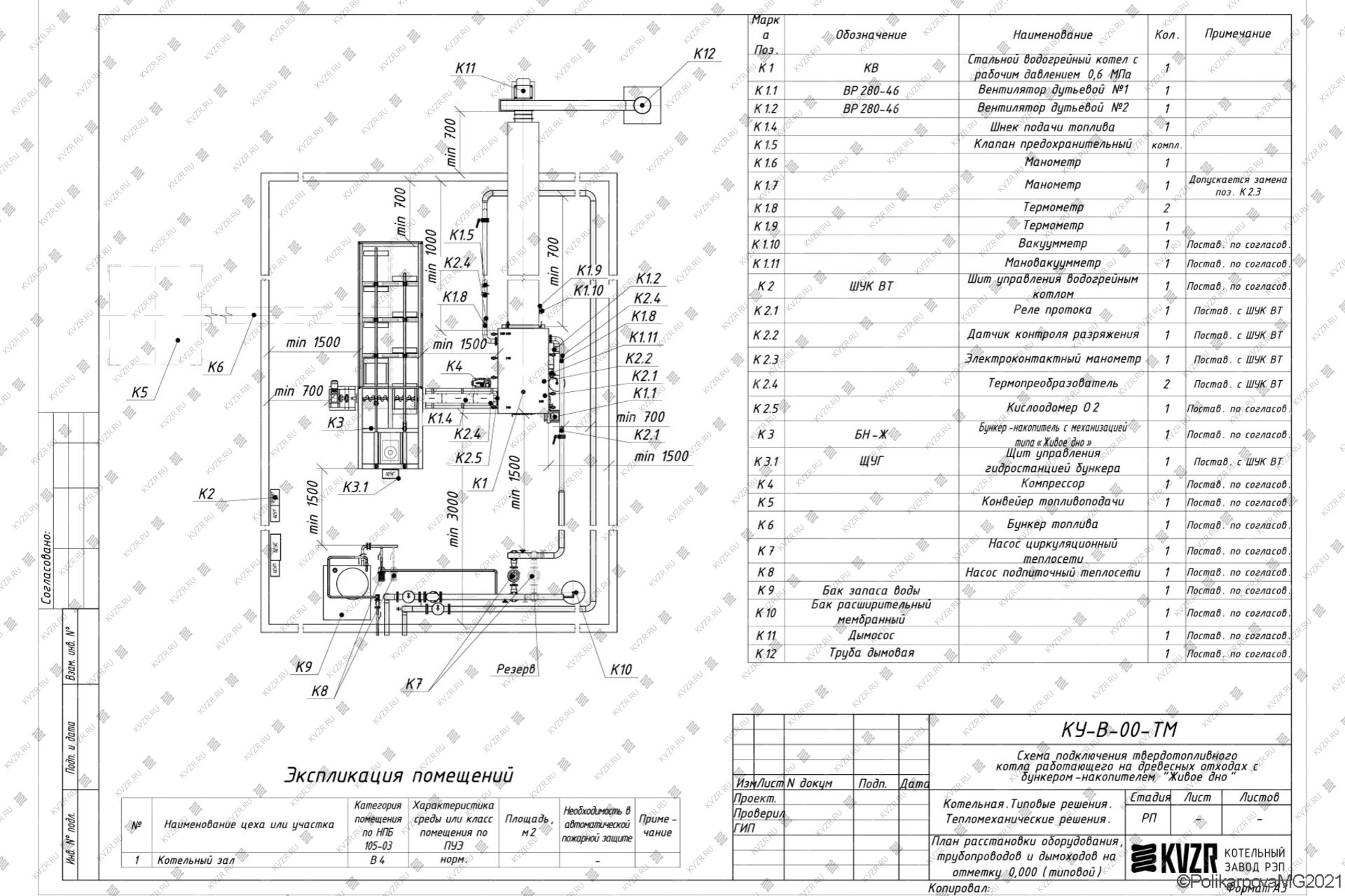Схема установки механизированного бункера ворошителя для опилок "Живое дно" с котлом работающим на древесных отходах. Данную схему можно использовать, как пример для разработки под свой объект или заказать у нас разработку индивидуальной схемы для вашей котельной.