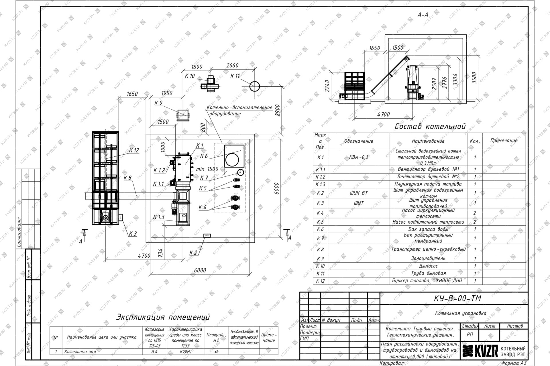 Водогрейный твердотопливный стальной отопительный котел 0.7 МВт на щепе, предназначен для получения горячей воды номинальной температурой на выходе из котла от 95 до 115 °С рабочим давлением до 0,6 (6,0) МПа (кгс/см), используемой в системах централизованного теплоснабжения на нужды отопления, горячего водоснабжения. Устанавливается в производственных, промышленных и отопительных котельных.